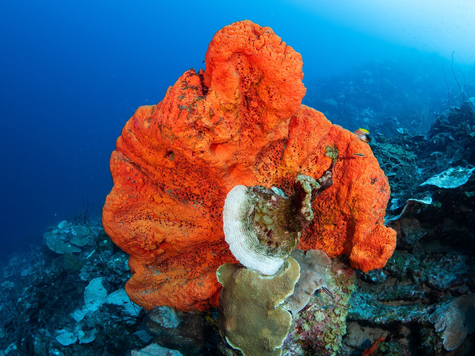 - Shallow reef teeming with colorful sponges and critters